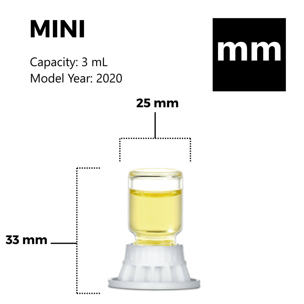 - Package contains (1) Mini liquid feeder bases and (1) glass screw-on vial, 3 mL capacity, as pictured