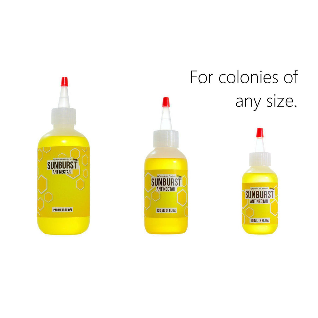 Overview: Sunburst Ant Nectar is the convenient, reliable sugar water alternative that ants love! Ant species that crave sweet foods will readily drink Sunburst Ant Nectar. Our advanced formula consists of a ready-to-use liquid, and works best with byFormica Liquid Feeders designed for ants (sold separately).