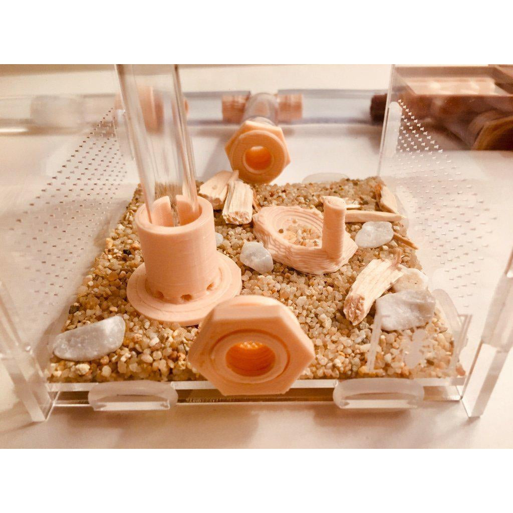 This kit is easily expandable with the growing size of the ant colony. Simply dock new nests/arenas through the supplied connection tube.