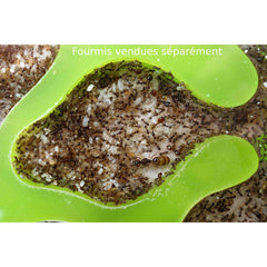 The rooms are built on a bioplastic and absorbent mineral-flooring humidifier. This technique offers a natural support to the ant, a precise management of humidity to a certain part of the nest, and a good bacteriological balance, free of water stagnation. The nest remains healthy in the long term and the ants develop in an optimal way.