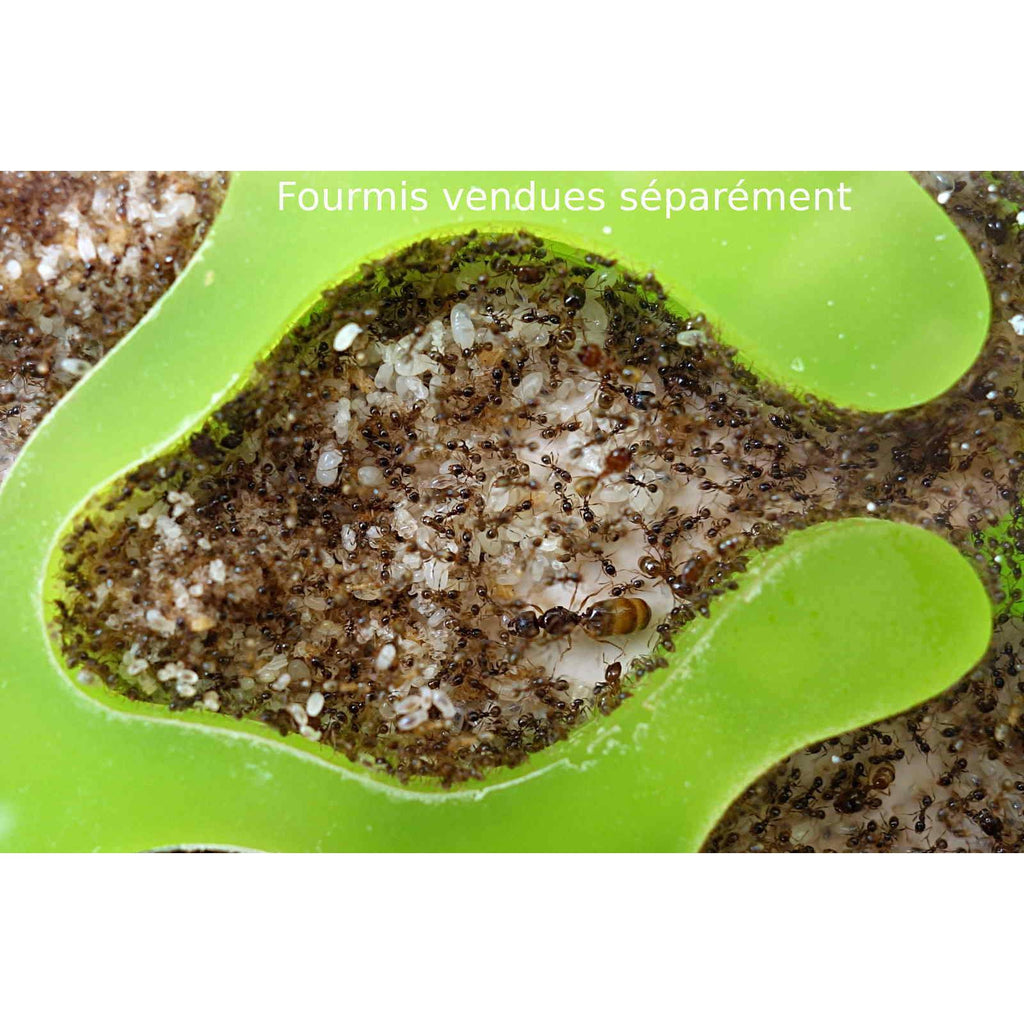 Inspired by natural anthills to optimise their use, the chambers are cut out of food-grade Plexiglas® acrylic to a height of 8mm and fixed on a damp mineral flooring. This compromise in height is suitable for large species as well as smaller ones and can accommodate a few hundred Messor workers or several thousand Pheidole, i.e. more than one year or two of development.