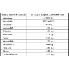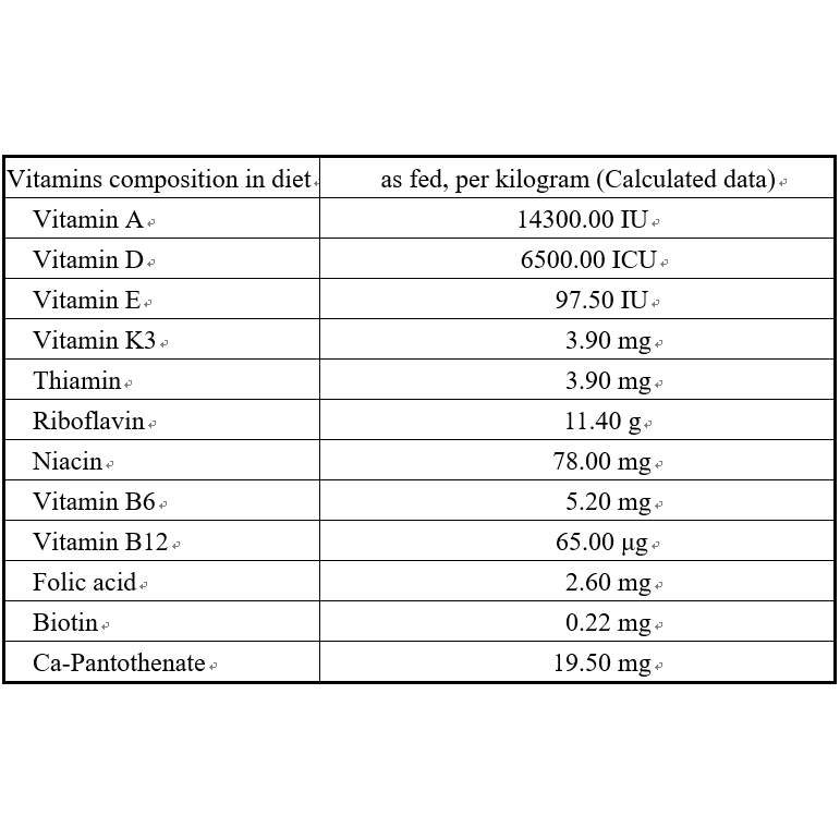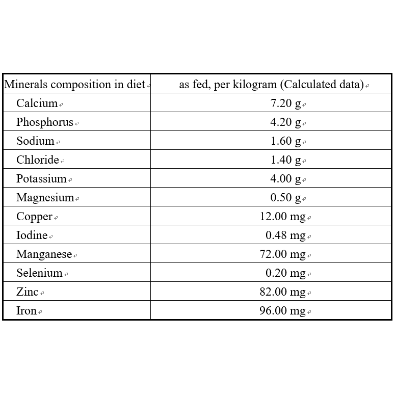 Sucrose, Brown sugar, Gelatin, Caseinate sodium, Methionine, Tryptophan, Arginine, Glycine, Maize starch, Choline chloride, Soybean oil, Vitamin A, D, E, K3, Thiamin, Riboflavin, Niacin, Vitamin B6 , B12, Folic acid, Biotin, Ca-Pantothenate, CuSO4·5H2O, ZnSO4·7H2O, MnSO4·H2O, Na2SeO3, FeSO4·7H2O, CaCO3, CaHPO4, KHCO3, KCl, K2HPO4, KI, MgSO4·7H2.