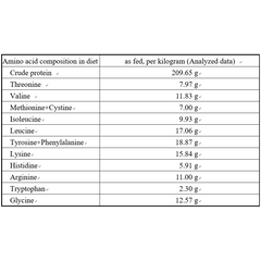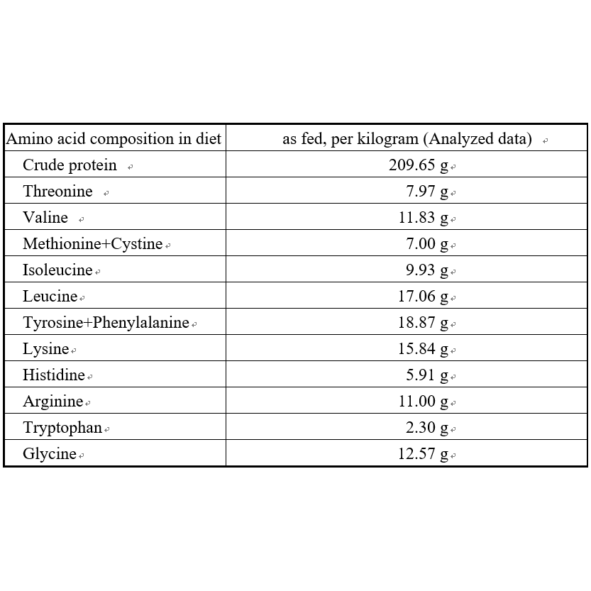 Analyze the nutrients of the raw materials and calculate the formula. After the food is prepared, repeat the analysis of the nutrients. List all amino acids and protein content in Table 1, and supplement the insufficient amino acids, fats, vitamins and minerals. Nutrient points are listed in Table 2 and 3.
