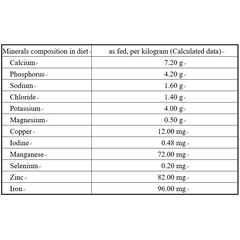 Ingredients include: Sucrose, Brown sugar, Gelatin, Caseinate sodium, Methionine, Tryptophan, Arginine, Glycine, Maize starch, Choline chloride, Soybean oil, Vitamin A, D, E, K3, Thiamin, Riboflavin, Niacin, Vitamin B6, B12, Folic acid, Biotin, Ca-Pantothenate, CuSO4·5H2O, ZnSO4·7H2O, MnSO4·H2O, Na2SeO3, FeSO4·7H2O, CaCO3, CaHPO4, KHCO3, KCl, K2HPO4, KI, MgSO4·7H2O.